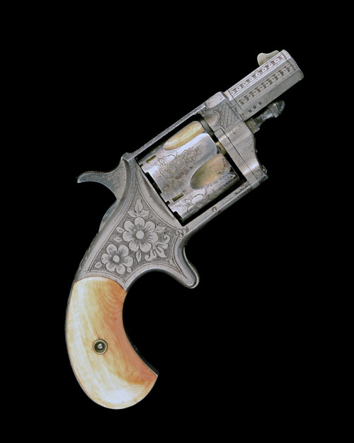 circa 1872, with octagonal 1 3/4in. barrel, blade fore-sight, four of the barrel-flats engraved with geometric patterns, the top-strap signed 'HOPKINS & ALLEN MFG CO, XL No6, PAT MAR 23 1871', florally engraved solid frame with geometric pattern engraved at breech, florally engraved fluted cylinder with traces of silver plate and gilt wash within the flutes, plated spurred hammer, smooth ivory birdshead grips, the backstrap engraved with floral designs and arabesques and a chequered sheath trigger, good amount of plated finish remaining throughout