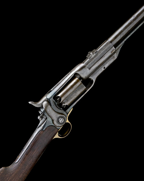 for 1856, with shortened round 21in. barrel, block fore-sight, dove-tailed rear-sight with two folding leaves, octagonal breech-section, solid frame, the top-strap sighting channel signed 'COL COLT HARTFORD CT USA', fully fluted cylinder, the side of action stamped 'COLTS PATENT NOV 24 1853', saddle ring, walnut straight-hand butt-stock with crescent heel-plate, brass trigger-guard tang and bow, hinged under-barrel rammer, the whole cleaned with some pitting present, especially to the barrel