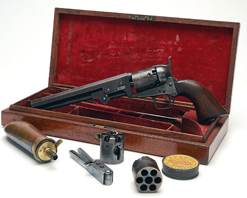 for 1855, with octagonal 7 1/2in. barrel, the top-flat signed 'ADDRESS COL COLT LONDON', bead fore-sight, rear-sight notch to the hammer-nose, plain cylinder with roll-engraved naval engagement scene, iron open frame marked 'COLTS PATENT', iron grip-straps and trigger-guard, smooth walnut one-piece grip and hinged under-barrel rammer, retaining traces of original finish throughout COMPLETE WITH its manufacturers fitted mahogany American storage case, radiused corners, compartmented and lined in red baize with red velvet to the inside of lid and taking the revolver with two spare cylinders (matching numbers but one example with one chamber burst) and together with a number of period accessories including a bag-shaped copper flask, an iron scissors bullet mold signed 'COLTS PATENT a cap tin, an 'L' shaped nipple-key and a cleaning rod