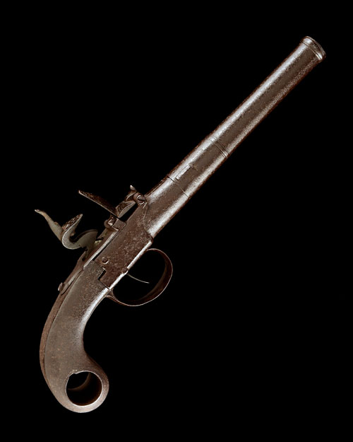 circa 1770, with turn-off 4 3/4in. cannon barrel, straight scratch rifling, squared boxlock central-hammer action (top-jaw and screw missing), all steel swollen butt with socket to turn-off a matching pistol, traces of engraving, sliding trigger-guard bow, the whole darkly stained with some surface corrosion