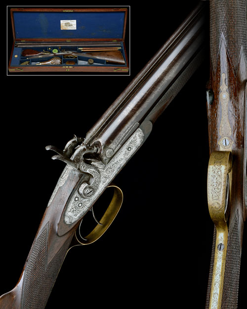 circa 1864, with 30in. barrels, the top rib signed 'WILLIAM ELLIS LONDON' (lifting), scroll engraved and banded breech-block, fully scroll engraved top-tang, border and scroll engraved bar-action locks signed 'W ELLIS', scroll and border engraved hammers, chequered walnut half-stock, yellow metal roll-engraved heel-plate with scroll engraved short heel-spur, border and scroll engraved yellow metal trigger guard bow and tang, the tang marked 'EDMUNDS PATENT', yellow metal finial, take-down wedge escutcheons and ramrod throat, no provision for ramrod thimbles and missing ramrod COMPLETE WITH its makers mahogany storage case, compartmented and lined in blue baize and complete with a number of period accessories including shot and powder flasks, nipple-key, powder-measure, cap tin and oil bottle, later cleaning rod and equipment, the interior of lid with parchment William Ellis Birmingham trade label.