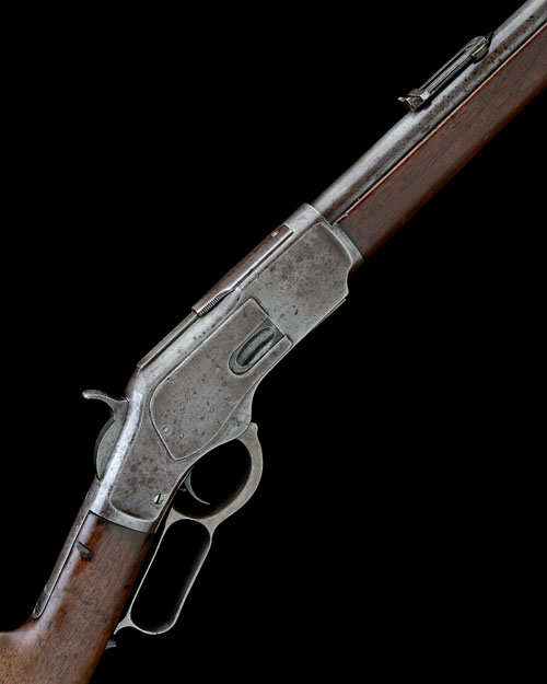 for 1892, with 24 1/4in. round barrel, the top marked ''WINCHESTER'S REPEATING ARMS NEW HAVEN CT' and 'KINGS IMPROVEMENT PATENTED MARCH 29 1866 OCTOBER 16 1860', dove-tailed fore-sight, elevating ladder rear-sight, calibre designation to breech, plain iron receiver with sliding dust-cover, central hammer, the top-tang marked 'MODEL 1873', walnut straight-hand butt-stock with iron 'shotgun' heel-plate, single set-trigger, brass cartridge lifter, plain walnut fore-end and full-length under-barrel magazine