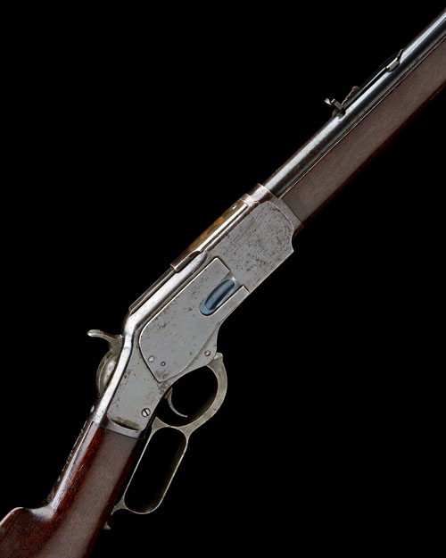 for 1883, with blued 24 1/4in. round barrel, the top marked ''WINCHESTER'S REPEATING ARMS NEW HAVEN CT' and 'KINGS IMPROVEMENT PATENTED MARCH 29 1866 OCTOBER 16 1860', dove-tailed fore-sight, buckhorn rear-sight, calibre designation to breech, plain iron blued receiver with stepped nocksform and sliding dust-cover, central hammer, the top-tang marked 'MODEL 1873', walnut straight-hand butt-stock with iron 'shotgun' heel-plate, brass cartridge lifter, plain walnut fore-end and full-length under-barrel magazine, the whole retaining much original finish