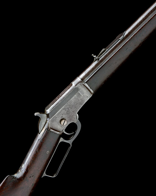 for 1892, with scarce 24in. round barrel, the top signed 'MARLIN FIRE ARMS CO NEW-HAVEN CT USA' together with patent dates to 1892, dove-tailed blade fore-sight, buckhorn rearsight, plain receiver with take-down screw and sliding bolt, central hammer, no model designation to top-tang, walnut straight-hand butt-stock with iron crescent heel-plate, plain walnut fore-end and full-length pull-forward under-barrel tubular magazine, traces of finish in sheltered areas