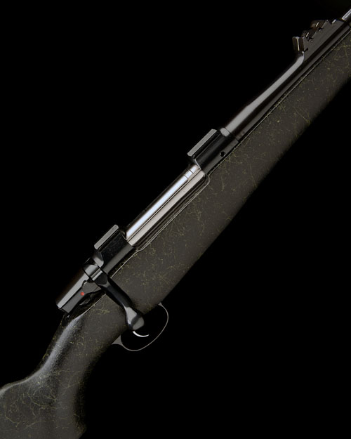 25 1/4in. nitro barrel with open sights and two folding leaf sights marked 100, 200 and 300, ramp-mounted bead fore-sight with hood, square bridge receiver, hinged floorplate with push button release, set trigger, synthetic black with green web pistolgrip stock, cheekpiece, sling eyes, 14 1/8in. pull including 1in. rubber recoil pad