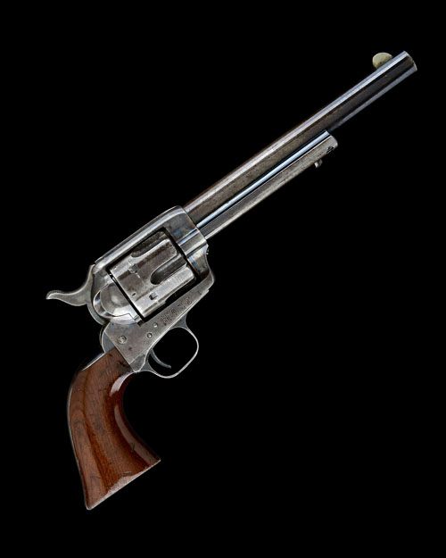 for 1874, with round 7 1/2in. barrel, the top signed 'COLT'S PT F A MFG CO HARTFORD CT USA', nickel blade fore-sight, sighting groove to the top-strap, fluted cylinder with matching number, plain frame with front mounted cylinder retaining screw and two line patent details, the right hand side stamped with a stylised Union Jack flag and the designation 'A38', iron trigger-guard and grip-straps, the heel stamped in the wood 'C.G. BALES, DURBAN', smooth walnut one-piece grip and under-barrel spring-loaded ejector rod with 'bullseye' thumb-piece, strong traces of original finish throughout
