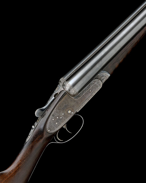 27 1/2in. nitro chopperlump barrels, 2 3/4in. chambers, bored approx. true cyl. and 1/4 choke, action with removable striker discs, automatic safety with gold-inlaid 'S' detail, gold-inlaid cocking indicators, rolled-edge triggerguard, border and acanthus scroll engraving, 14 1/2in. stock, weight 6lb. 13oz.