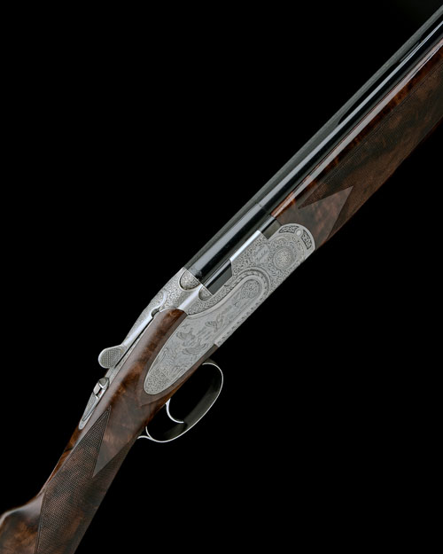 hold-open toplever, manual safety with integral barrel selector switch, the action and furniture engraved with floral acanthus scrollwork, the decorative sideplates engraved with naturalistic scenes of partridge and woodcock, the underside with the portrait of a pair of hounds, engraved 'BERETTA GALLERY', bright finish, 14 1/2in. highly figured stock including wooden buttplate, weight 6lb. 6oz. (6lb. 4oz. with 28-bore barrels), in it makers suede case, the extra barrels in a Perazzi universal barrel case