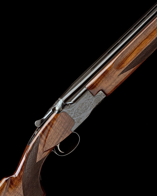hold-open toplever, manual safety with integral barrel selector switch, blacked action with border and partial acanthus scroll engraving, 14in. pistolgrip stock including buttplate, weight 6lb. 8oz. (20-bore), 6lb. 11oz. (28-bore) and 6lb. 13oz. (.410), in a vinyl case with provision for all sets of barrels