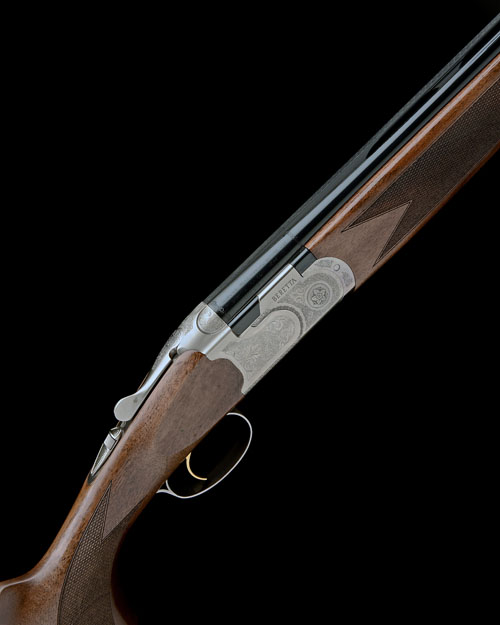 29 1/2in. nitro barrels with 6mm raised ventilated matt rib, 3in. chambers, multichokes (with spares), hold-open toplever, automatic safety with integral barrel selector switch, gold-washed single trigger, acanthus scroll engraving, silver finish,14 3/4in. pistolgrip stock including 5/8in. rubber recoil pad, in its makers universal case