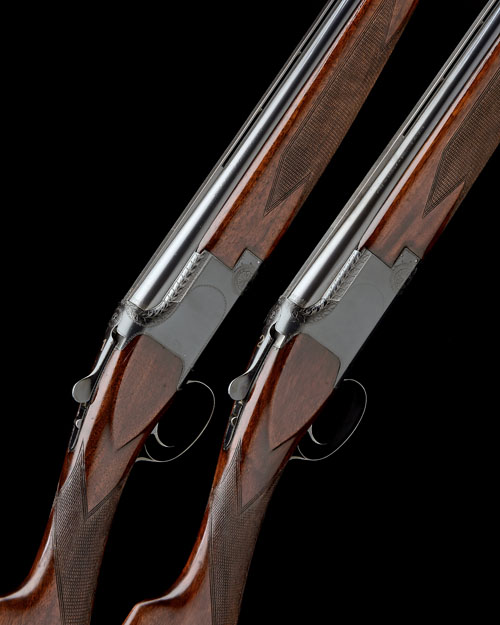 27 1/2in. nitro barrels with 5mm raised ventilated matt ribs, 2 3/4in. chambers, bored approx. imp. cyl. and 1/4 choke (No.1) 1/4 choke in both (No.2), hold-open toplevers engraved '1' and '2', automatic safety with integral barrel selector switch, blacked border engraved actions, 15 1/4in. roachbelly stocks including 3/4in. leather-covered rubber recoil pads, weight 7lb. 1oz. (No.1) 6lb. 14oz. (No.2), in a Guardian canvas and leather motorcase