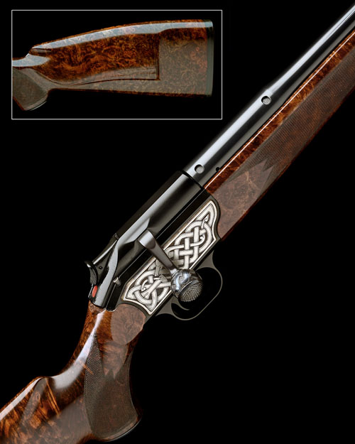 22in. nitro barrel with block mounted open sights with gold-inlaid sight line, ramp-mounted bead fore-sight, the breech end notched for Blaser quickly-detachable telescopic sight mounts, removable rotary magazine, black receiver with decorative side panels carved in high relief with celtic soul binding knotwork with serpent, the bolt handle, sight ramps and barrel sling eye mount engraved en suite, exhibition grade burr walnut stock with sculpted cheekpiece, blued steel pistolgrip-cap, the fore-end with darkwood schnabel finial, 15in. pull including 5/8in. rubber recoil pad