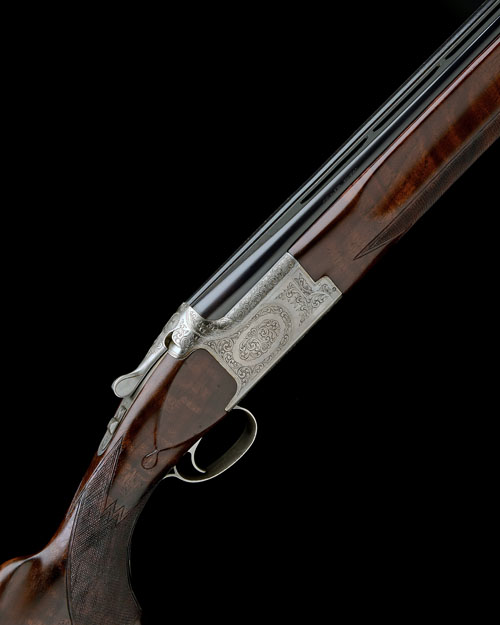 30in. nitro barrels with 13mm raised ventilated matt rib, 2 3/4in. chambers, bored approx. imp. cyl. and 1/4 choke, hold-open toplever, manual safety with integral barrel selector switch, beaded border and acanthus scroll engraving, brushed finish, 14in. pistolgrip stock with raised comb, including 1/2in. extension, weight 8lb.