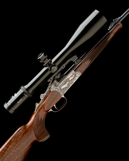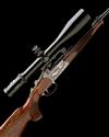 23 3/8in. nitro barrel with open sights and ramp-mounted blade foresight, the breech end mounted with a Swarovski Habicht 3-12x56 Nova telescopic sight in quickly-detachable mounts, lightweight alloy action with sprung breech face, hold-open toplever, manual safety / cocking lever, relief engraved with oak leaf and acorn motifs, surrounding woodland scenes of roe and red deer, the sight ramps and sight mount bases engraved en suite, 14in. well-figured pistolgrip stock with sculpted cheekpiece, pistolgrip-cap with wild boar engraved escutcheon, sling swivel removed and including 1/2in. rubber recoil pad, weight 6lb. 13oz.
