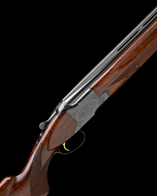 32in. nitro barrels with 16mm ventilated matt top-rib, white bead fore-sight and intermediate bead sight, 2 3/4in. chambers, bored approx. 3/4 and full choke, hold-open toplever, manual safety with integral barrel selector switch, blued action with border and scroll engraving, 14 1/2in. pistolgrip stock including 3/4in. ventilated rubber recoil pad, weight 7lb. 14oz.