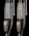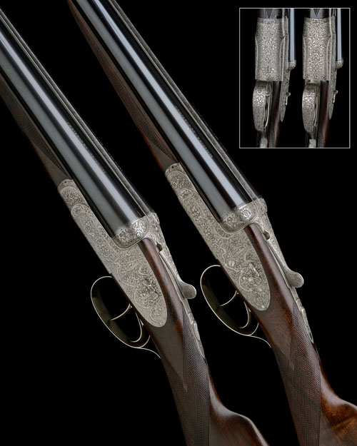 27 5/8in. (70cm) nitro barrels with tapered raised matt ribs, tubes engraved 'A CORDY & FILS FTS. BTES. LIEGE. CHRISTOPHE - BRUXELLES', 2 3/4in. chambers, bored approx. 1/4 and 1/2 choke (No.1) and 1/4 choke both (No.2), No.2 right wall thickness below recommended minimum, treble-grip actions with hidden third bites, gas checks, removable striker discs, manual safeties, hand-detachable sidelocks, cocking-indicators, articulated front triggers, fences carved in high relief with floral motifs, the actions, lockplates and furniture finely engraved with intricately intertwined floral and acanthus scroll designs, interwoven with hanging ribbon and bow details, the triggerplates signed 'graveur L. Corombelle. AAPB', bright finish overall, 14 3/8in. highly-figured stocks, fore-ends inset in silver with the initials 'G.S.', weight 6lb. 6oz.