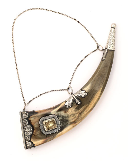 circa 1890, with flat horn body, approximately 11 1/2in. overall with engraved silver 'spout', a large rectangular cairngorm stone in a silver floral mount to the side of body, silver shell and scroll embossed end mount with rope border design, central silver suspension mount carved and engraved in the form of a Scottish thistle, complete with a white-metal suspension chain