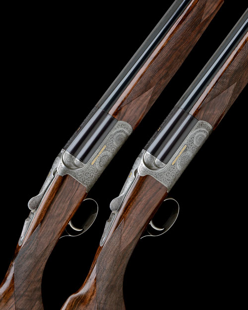 28in. nitro barrels with 7mm solid matt top-ribs gold-inlaid '1' and '2' and with flashes of acanthus scroll engraving at the breech ends, 2 3/4in. chambers, bored approx. 1/4 and 3/4 choke (both), hold-open toplevers gold-inlaid '1' and '2', automatic safeties with integral triggerplate release catches and gold-inlaid 'SAFE' details, non-selective single triggers, best fine bouquet and scroll engraving with the makers name inlaid in gold, the undersides gold-inlaid with the model designation, the triggerplates signed 'Chiara', 15 1/2in. highly-figured semi-pistolgrip stocks including 1/2in. rubber recoil pads, weight 6lb. 13oz. (No.1) and 6lb. 11oz. (No.2), in a leather double motorcase