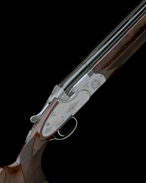 32in. nitro barrels with 9mm raised ventilated matt rib, 2 3/4in. chambers, bored approx. 3/4 and full choke, hold-open toplever, manual safety, double rolled-edge triggerguard, border and partial acanthus scroll engraving, bright finish,14 1/2in. pistolgrip stock with adjustable comb, including 1in. rubber recoil pad, weight 9lb. 2oz., in its makers universal case