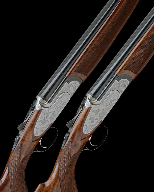 29 1/4in. nitro barrels with 8mm raised solid matt ribs, 3in. chambers, bored approx. 1/4 and 1/2 choke (both), hold-open toplevers, automatic safeties with integral barrel selector switches, border and acanthus scroll engraving surrounding game scenes, the undersides engraved with the MacNab, bright finish, 14 1/2in. semi-pistolgrip stocks including 1/4in. wooden buttplates, weight 6lb. 3oz. (both), in an Emmebi double guncase