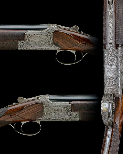 26 3/8in. (67cm) nitro barrels with 5mm ventilated matt top-rib, 2 3/4in. chambers, bored approx. 1/4 and 3/4 choke, three-piece fore-end, hold-open toplever, hand engraved serial number, manual safety with integral barrel selector switch, deep bold scroll engraving with ornate borders and central scenes of pheasant and partridge in flight similar to C4 design and signed 'DEBRUS', the underside with a lone woodcock, the triggerguard with a shield gold-inlaid 'PH', bright finish, 14 1/4in. well-figured roachbelly stock, weight 6lb. 15oz.