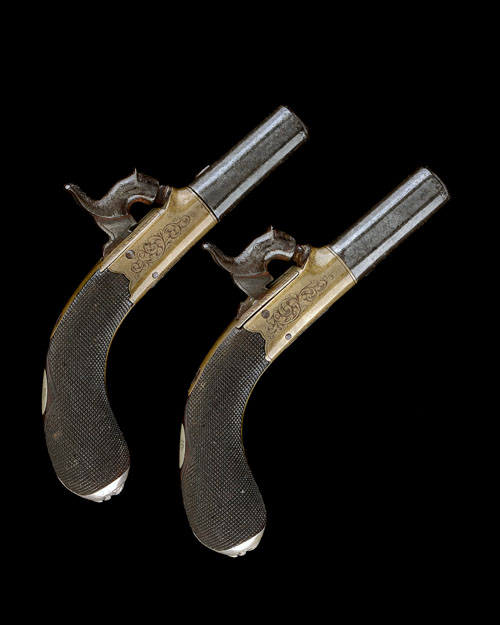 A GOOD PAIR OF 140-BORE PERCUSSION TURN-OFF BRASS-BODIED MUFF-PISTOLS OF SMALL SIZE, UNSIGNED, no visible serial number,