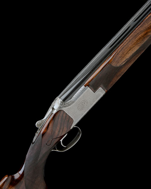 30in. nitro barrels with 16mm raised ventilated matt top-rib, 2 3/4in. chambers, bored approx. full choke in both, hold-open toplever, manual safety with integral barrel selector switch, beaded border and acanthus scroll engraving with a central bouquet, bright finish, 14 1/4in. highly-figured pistolgrip stock including 1in. ventilated rubber recoil pad, weight 8lb., in a tan case