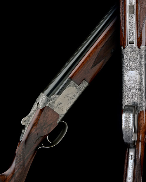 26 3/8in. (67cm) nitro barrels with 6mm raised matt top-rib, 2 1/2in. chambers, bored approx. 1/4 and imp. cyl. choke, hold-open toplever, manual safety with integral barrel selector switch, rounded bar action with bold acanthus scrollwork surrounding oval vignettes of woodcock, pointer and partridge, the underside with a solitary French partridge, bright finish overall, 15in. boldly-figured stock including buttplate, weight 6lb. 13oz., in a Browning faux fur lined vinyl case