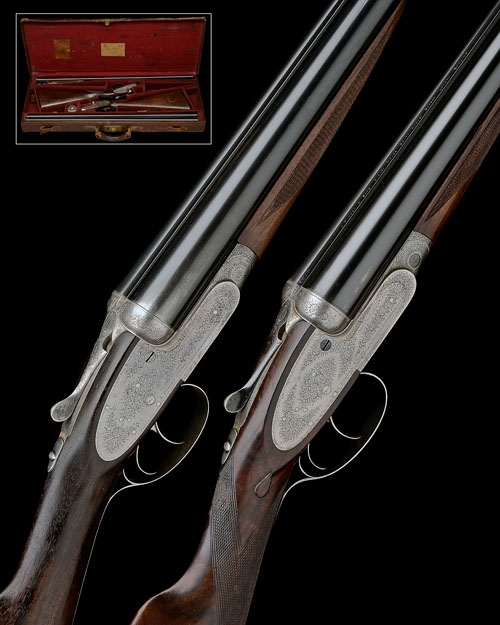 Provenance: The makers have kindly informed us that the No.1 gun was completed in 1901 for B. Hatton-Croft and that he commissioned the No.2 gun to match in 1904. They re-stocked the No.2 gun in 1970 and built new barrels for it in 1974.