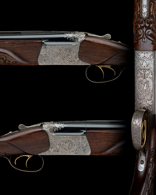 28 3/8in. (72cm) nitro barrels with 6mm ventilated matt top-rib, carved and white metal-inlaid with scrollwork at the breech end, 2 3/4in. chambers, bored approx. 1/4 and 3/4 choke, hold-open toplever, automatic safety, gold-washed triggers, the action engraved with fine floral and acanthus scrollwork on a stippled background and surrounding game scene vignettes of mallard and capercaillie, the underside with a howling wolf, the triggerguard with a squirrel, the triggerplate signed by the engraver, 14 1/2in. pistolgrip stock with sculpted cheekpiece and hogsback comb, the pistolgrip, butt and semi-beavertail fore-end carved in relief with flowing acanthus designs, slight movement to stock, weight 7lb. 10oz.