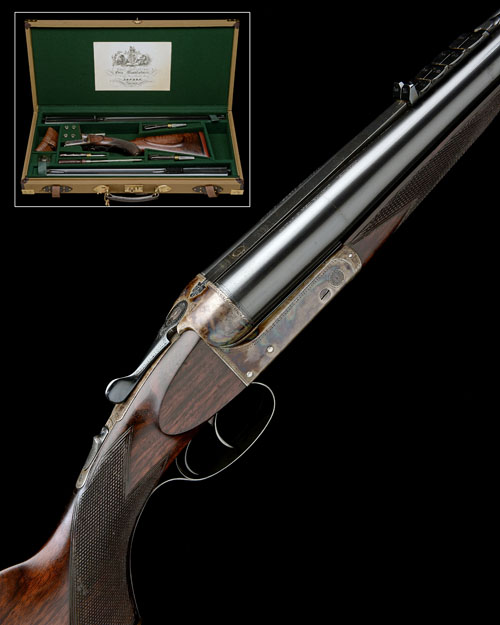unsigned treble-grip action with removable striker discs, unusual chamfered-edge action bar, automatic safety, beaded border engraving, the fences with a touch of acanthus scrollwork, retaining virtually full renewed colour-hardening and finish, 14 1/2in. well-figured pistolgrip stock with cheekpiece, engraved and colour-hardened steel pistolgrip-cap, blank silver oval escutcheon and blank 9ct. gold shield escutcheon, including 7/8in. rubber recoil pad, fore-end with grip-catch release lever, weight 10lb. 6oz., in a fitted canvas and leather case with full complement of accessories and provision for both sets of barrels