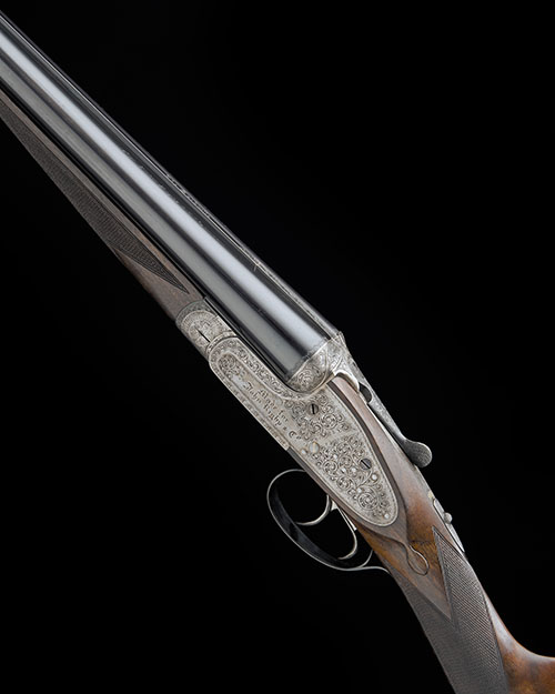 26in. nitro reproved chopperlump barrels (in 2013), rib engraved in gothic script 'The Sackville', tubes engraved in gothic script 'Made by Pedro Arrizabalaga Eibar for John Rigby & Co. London.', 2 3/4in. chambers, bored approx. imp cyl. and 1/4 choke, Holland & Holland style self-opening system, carved leaf fences, removable striker discs, automatic safety with gold-inlaid 'SAFE' detail, dipped edge lockplates, gold-inlaid cocking-indicators, articulated front trigger, border and acanthus scroll engraving, 14 5/8in. figured stock, weight 6lb. 8oz., in a brass-cornered leather case