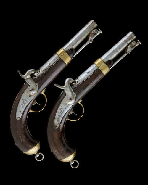 circa 1840, with round, slightly tapering 6 1/2in. barrels, solid squared top-tangs marked 'MLE 1837', off-set top-mounted nipples, plain curved back-action locks signed 'MRE RLE DE CHATELLERAULT', hammers of slightly different forms, plain walnut half-stocks (both cracked at grip), brass furniture, one pistol with full-length iron back-strap, side-mounted iron belt-hooks and captive iron under-barrel stirrup ramrods, inspectors stamps to many components
