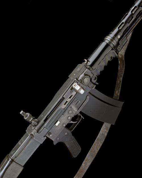 circa 1970, with 26 1/2in. barrel including flash-hider, folding tunnel-fore-sight, folding adjustable diopter rear-sight, iron ventilated hand-guard, pressed-metal receiver and frame, three-position selector (currently semi automatic only), black rubber-coated butt-stock, black plastic pistol-grip, detachable box magazine, black plastic fore-grip and integral folding bi-pod, fitted with a Swiss military leather sling