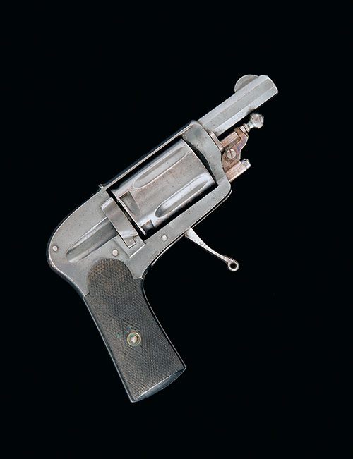 circa 1910, with blued octagonal 1 3/4in. barrel, crescent fore-sight, plain blued hammerless solid frame stamped with a makers mark of a star above a recumbant crescent moon, also stamped '6mm', long blind-fluted cylinder, finely chequered two-piece ebony grips, concealed folding trigger and centrally mounted swing-out ejector-rod, the whole retaining virtually all its original factory finish