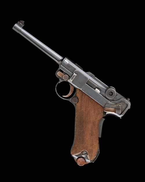 dated for 1918, re-barrelled for Switzerland with blued tapering 4 3/4in. barrel, dove-tailed blade fore-sight, fixed notch rear-sight to rear of toggle, stamped 1918 at breech and marked withy the DWM monogram on top of toggle, blued receiver and frame, fully chequered walnut grips, grip-safety and stock-board lug, all matching numbers except magazine, thinning to finish on high-spots