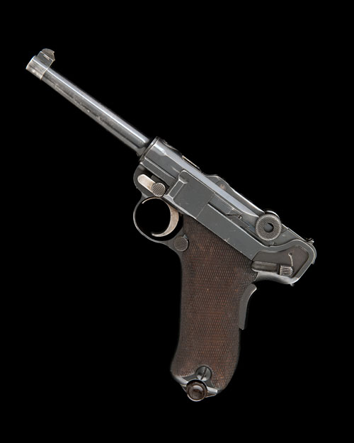 for 1910, with blued tapering 4 3/4in. barrel, dove-tailed blade fore-sight, fixed notch rear-sight to rear of toggle, stamped with a Swiss cross within a shield at breech and marked with the DWM monogram on top of toggle, blued receiver and frame, chequered walnut grips with plain border, grip-safety, no stock-board lug, all matching numbers except later type 29 magazine, thinning to finish on high-spots