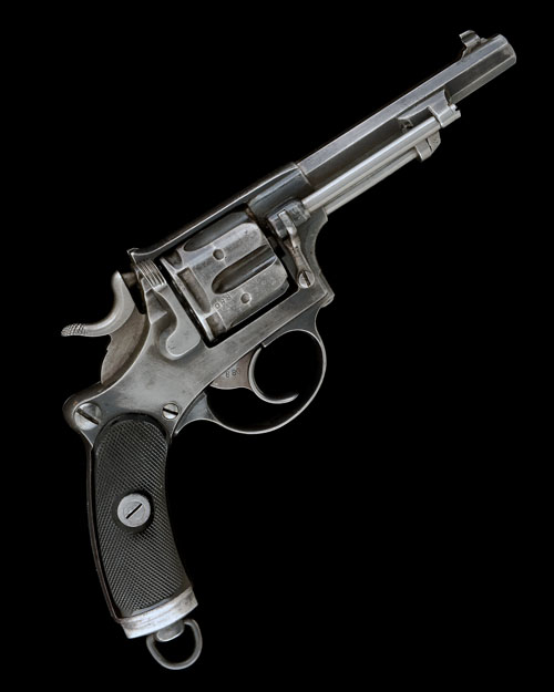 circa 1890, with octagonal 4 1/2in. barrel, dove-tailed fore-sight, standing notch rear-sight to the top-strap, fluted cylinder, loading-gate with in-built safe, hinged field-strippable frame, finely chequered hard-rubber-grips, heel with lanyard ring and provision for shoulder-stock, side-mounted under-barrel ejector-rod, traces of faded finish throughout