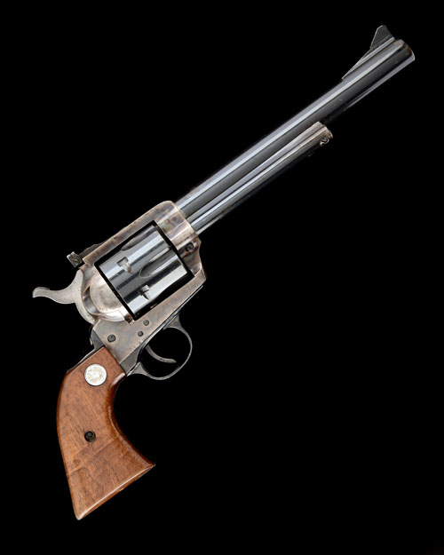 ** A COLT, USA .357 (MAG) SIX-SHOT SINGLE-ACTION REVOLVER, MODEL 'NEW FRONTIER S.A.A.', serial no. 6053NF, for 1970, with 7 1/2in. blued barrel, ramp and blade fore-sight, Colt address and model details stamped to barrel, adjustable rear-sight, blued fluted cylinder, colour-hardened frame, hammer with polished sides, blued grip-straps and trigger-guard, smooth walnut grips inlet with the Colt trademark, light wear to finish