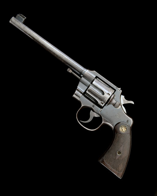 for 1916, with 7 1/2in. signed barrel, block and blade fore-sight, drift adjustable rear-sight to the back of top-strap, swing-out fluted cylinder, plain blued frame, chequered walnut grips with 'Colt' medallions, the whole retaining a good proportion of original finish