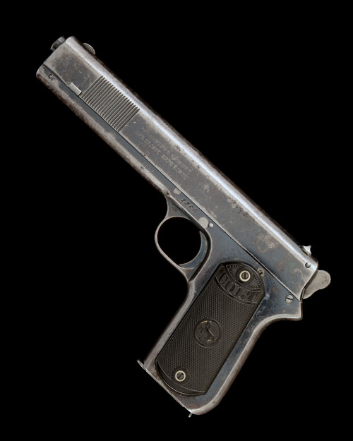 for 1905-6, with blued 6in. barrel, blued, sighted slide marked on the right hand side 'AUTOMATIC COLT' over 'CALIBRE 38 RIMLESS SMOKELESS', the left hand side marked 'BROWNING'S PATENT' over 'APR 20. 1897, SEPT 9. 1902' together with the makers details and address, plain blued frame, colour-hardened hammer, chequered hard-rubber grips embossed 'COLT' (one badly cracked) together with the Colt trademark, blued trigger, good amount of original finish remaining