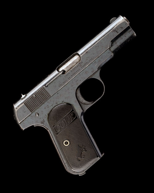 for 1915, with blued sighted slide, the left hand side marked 'PATENTED APR 20 1897 DEC 22 1903' along with the Colt address and 'COLT AUTOMATIC CALIBRE .32 RIMLESS SMOKELESS' to the reverse, blued frame with grip-safety, hard-rubber chequered grips with 'COLT' in raised letters and the stallion trademark, the whole retaining much original finish