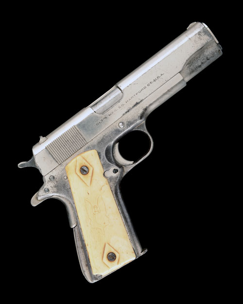 for 1952, with 5in. barrel, plated sighted slide signed on the right hand side with the model designation on the left, plated frame with grip safety and arched mainspring housing, ribbed trigger-blade, smooth ivory grips amateurly carved with an outline of the winged 'S.A.S.' dagger badge on both sides and retaining its correct magazine marked 'COLT .38 SUPER AUTO', the whole with a fair amount of original finish