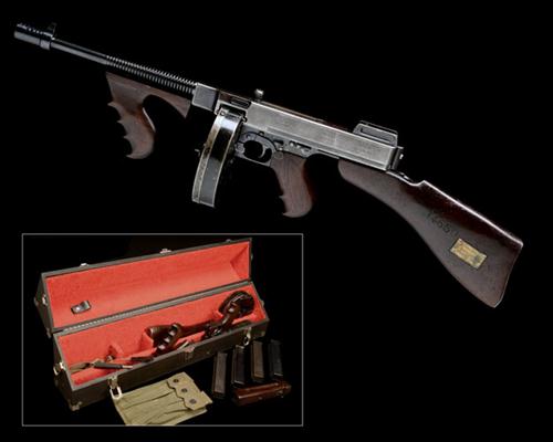 first production run, with finned 13in. barrel (additional South African registration number WR115044) and including built on 'Cutt's' compensator, tapered blade fore-sight, blued squared receiver stamped 'MODEL OF 1921', the serial number and 'THOMPSON SUBMACHINE GUN CALIBRE 45 AUTOMATIC COLT CARTRIDGE, MANUFACTURED BY COLT'S PATENT FIREARMS MFG. CO. HARTFORD CONN. USA', adjustable elevating 'Lyman' ladder rear-sight, the top of receiver marked with the 'Thompson' trademark, the left hand side of trigger-group with rotating safety and selector (see notes below), detachable wood butt-stock, the left hand side stamped with the number '14650' and inlet with a brass plaque engraved 'PRESENTED BY G. ANDERSON, ESQ. MARCH 1941', iron heel-plate with trapdoor for oil-bottle and side-mounted sling-swivel, wood finger-grooved pistol-grip and finger-grooved pistol-grip fore-end with side-mounted swivel, the whole retaining much original finish (faded on the receiver) COMPLETE WITH a black leatherette covered 'FBI' transit box, the interior lined in red felt and containing the gun and a 50-round drum magazine, 4 stick magazines, a webbing magazine pouch, cleaning equipment, a canvas sling and a spare splinter fore-end, TOGETHER WITH an extensive file of research on this and other Thompson guns