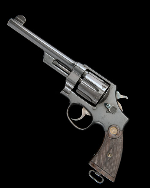 circa 1910, with blued, round 6 1/2in. barrel, makers details and patent dates to 1906 on the top of barrel, full crescent fore-sight, blued fluted cylinder, plain blued frame chequered walnut grip-plates with inset 'Smith & Wesson' monogrammed medallions to top and lanyard loop to butt, British army 'sold out of service' marks, re-finished