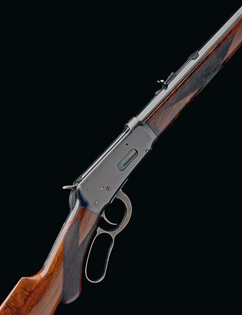 for 1910, with blued octagonal 26in. tapering barrel, the left-hand side of barrel signed 'MANUFACTURED BY THE WINCHESTER REPEATING ARMS CO, NEW HAVEN CONN USA PATENTED AUGUST 21 1894 ', dove-tailed gold-washed folding ring fore-sight, buckhorn rear-sight with adjustable blade, blued receiver, the top-tang drilled for peep-sight, the tapped holes with keeper screws and stamped with 'MODEL 1894 WINCHESTER TRADE MARK REG IN US PAT OFF', highly figured walnut chequered pistol-grip butt-stock, hard-rubber pistol-grip cap embossed with 'WINCHESTER REPEATING ARMS CO', blued iron crescent heel-plate, figured walnut chequered fore-end, blued nose-cap, full-length under-barrel magazine, the whole retaining a remarkable amount of original finish and colour throughout