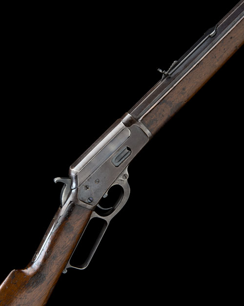 circa 1900, with blued 24in. octagonal barrel signed 'MARLIN FIRE-ARMS CO NEW HAVEN CT USA PATENTED OCT 11 1887 APRIL 2 1889', nickel-bladed 'Rocky Mountain' fore-sight, buckhorn rear-sight, plain receiver, the top-flat marked 'MARLIN SAFETY', top-tang drilled for aperture sight (keeper screws present), walnut straight-hand butt-stock with iron crescent heel-plate, the wood stamped 'W.J. DICK' alongside the trigger-guard strap, plain walnut fore-end with iron nose-cap and full-length under-barrel magazine, the whole with a fair amount of original finish