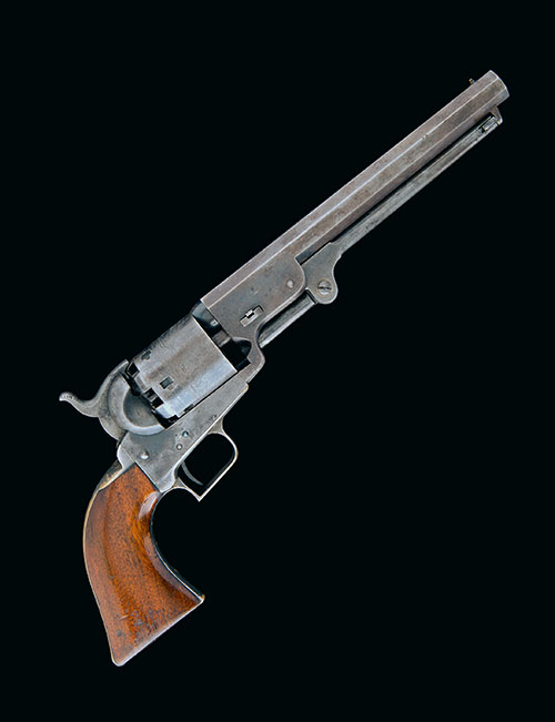 first year of production, 1850, with 7 1/2in. octagonal barrel signed 'ADDRESS SAML COLT NEW YORK CITY', bead fore-sight, rear-sight notch to the hammer-nose, plain cylinder with roll-engraved naval engagement scene, iron open frame marked 'COLTS PATENT', silver-plated brass grip-straps and square-backed trigger-guard (plating with losses mainly to backstrap), smooth walnut one-piece grip and hinged under-barrel rammer, strong traces of original blued finish and colour throughout