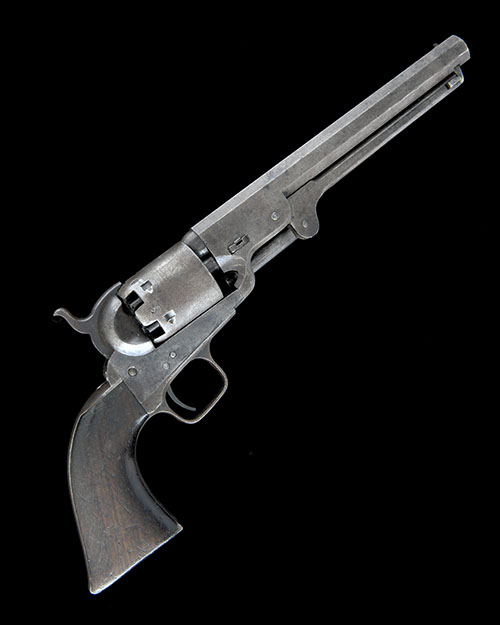 for 1855, with octagonal 7 1/2in. barrel, the top-flat signed 'ADDRESS COL COLT LONDON', bead fore-sight, rear-sight notch to the hammer-nose, plain cylinder with roll-engraved naval engagement scene, iron open frame marked 'COLTS PATENT', iron grip-straps and trigger-guard, smooth walnut one-piece grip and hinged under-barrel rammer, stained with no finish