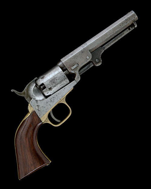 for 1862, with 5in. octagonal barrel, the top-flat signed 'ADDRESS COL SAML COLT NEW-YORK US AMERICA', bead fore-sight, plain cylinder with traces of roll-engraved 'stagecoach hold-up' scene, open iron frame, brass grip-straps and trigger-guard, one-piece smooth walnut grip and articulated under-barrel rammer, period London proofs, traces of finish